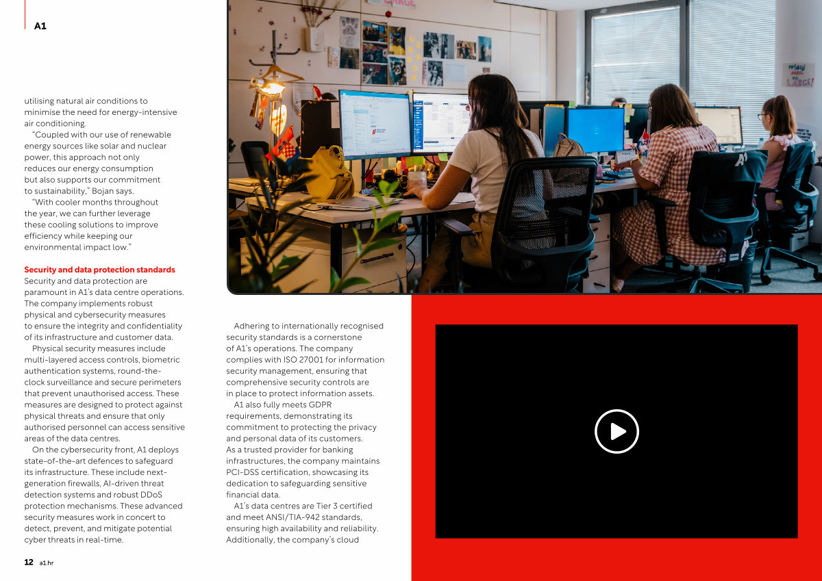 Security and data protection standards Security and data protection are paramount in A1’ s data centre operations. The company implements robust physical and cybersecurity measures to ensure the integrity and confidentiality of its infrastructure and customer data. Physical security measures include multi-layered access controls, biometric authentication systems, round-theclock surveillance and secure perimeters that prevent unauthorised access. These measures are designed to protect against physical threats and ensure that only authorised personnel can access sensitive areas of the data centres.