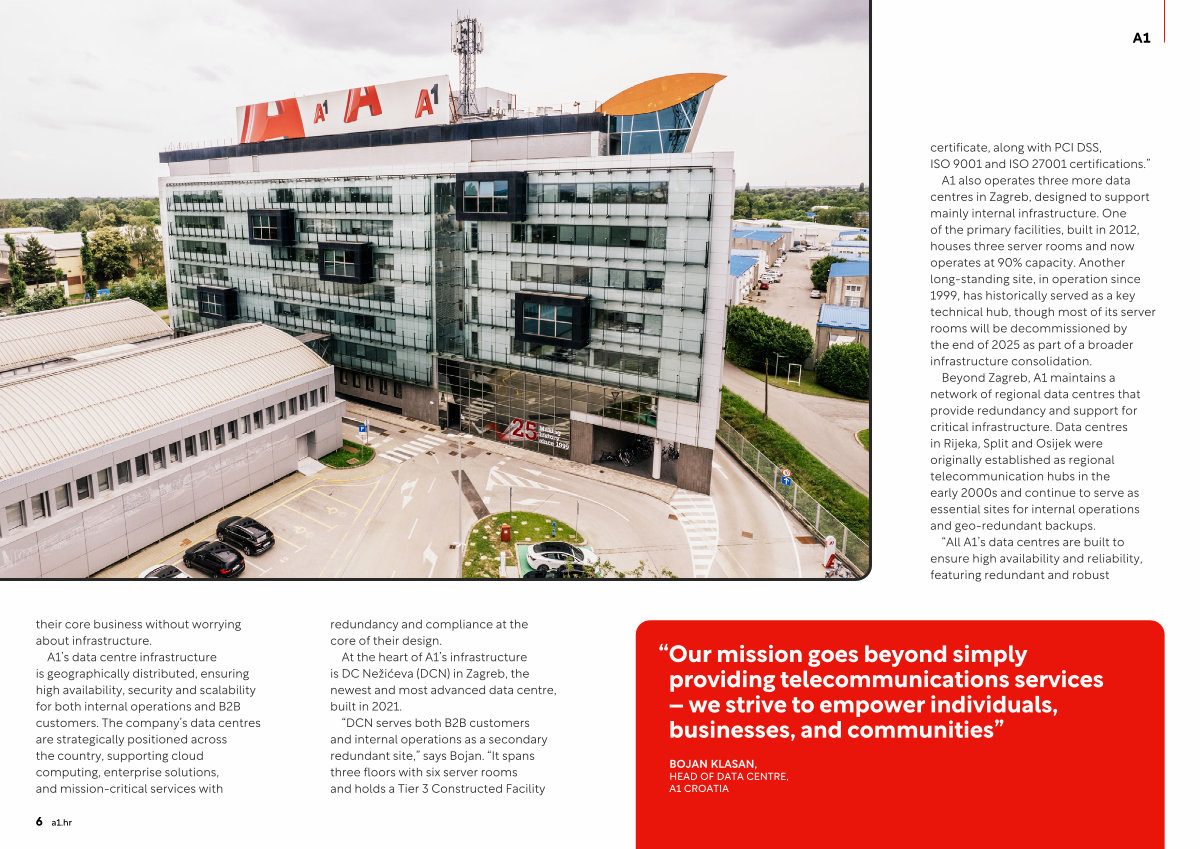 certificate, along with PCI DSS, ISO 9001 and ISO 27001 certifications.” A1 also operates three more data centres in Zagreb, designed to support mainly internal infrastructure. One of the primary facilities, built in 2012, houses three server rooms and now operates at 90 % capacity. Another long-standing site, in operation since 1999, has historically served as a key technical hub, though most of its server rooms will be decommissioned by the end of 2025 as part of a broader infrastructure consolidation.
