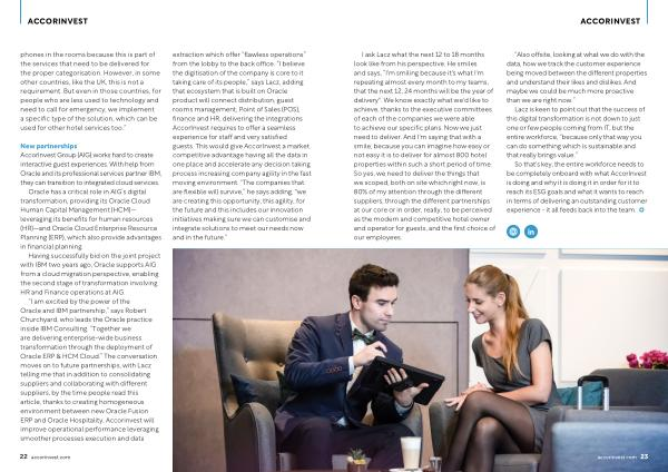 “ I am excited by the power of the Oracle and IBM partnership ,” says Robert Churchyard , who leads the Oracle practice inside IBM Consulting . “ Together we are delivering enterprise-wide business transformation through the deployment of Oracle ERP & HCM Cloud .” The conversation moves on to future partnerships , with Lacz telling me that in addition to consolidating suppliers and collaborating with different suppliers , by the time people read this article , thanks to creating homogeneous environment between new Oracle Fusion ERP and Oracle Hospitality , Accorinvest will improve operational performance leveraging smoother processes execution and data extraction which offer “ flawless operations ” from the lobby to the back office . “ I believe the digitisation of the company is core to it taking care of its people ,” says Lacz , adding that ecosystem that is built on Oracle product will connect distribution , guest rooms management , Point of Sales ( POS ), finance and HR , delivering the integrations AccorInvest requires to offer a seamless experience for staff and very satisfied guests . This would give AccorInvest a market competitive advantage having all the data in one place and accelerate any decision taking process increasing company agility in the fast moving environment . “ The companies that are flexible will survive ,” he says adding , " we are creating this opportunity , this agility , for the future and this includes our innovation initiatives making sure we can customise and integrate solutions to meet our needs now and in the future .”