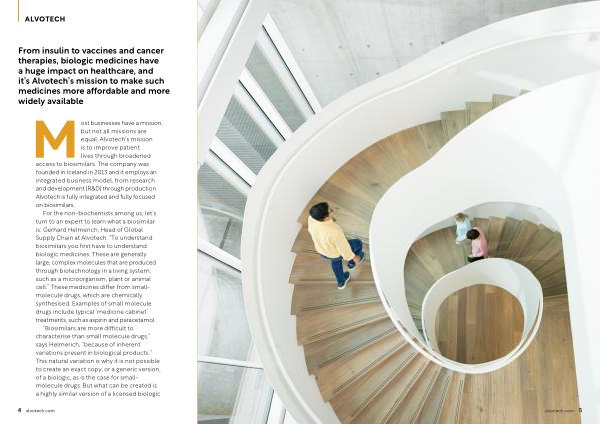 For the non-biochemists among us , let ’ s turn to an expert to learn what a biosimilar is : Gerhard Helmerich , Head of Global Supply Chain at Alvotech . “ To understand biosimilars you first have to understand biologic medicines . These are generally large , complex molecules that are produced through biotechnology in a living system , such as a microorganism , plant or animal cell .” These medicines differ from smallmolecule drugs , which are chemically synthesised . Examples of small molecule drugs include typical ‘ medicine cabinet ’ treatments , such as aspirin and paracetamol .