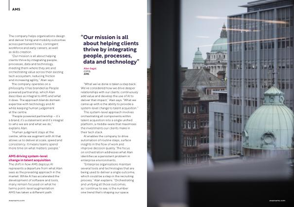AMS driving system-level change in talent acquisition The shift in how AMS deploys AI represents a departure from what Alan sees as the prevailing approach in the market. While AI has accelerated the development of software and tools, many remain focused on what he terms point-level augmentation. AMS has taken a different path.