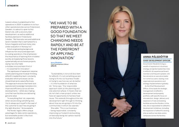 As the Chief Development Officer, Anna leads the strategic management of atNorth‘ s development and property portfolio, with specific focus on site selection, design, delivery and expansion of new and existing facilities across the Nordics. In this role, she is responsible for atNorth‘ s development initiatives, including the expansion of atNorth‘ s existing sites as well as new data centre campuses across the Nordics.