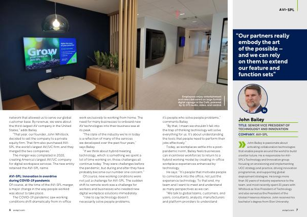 John Bailey is passionate about activating collaboration technologies that enable people around the world to build a better future . He is responsible for AVI- SPL ’ s Technology and Innovation group , focusing on envisioning and implementing UCC strategy and practice , driving innovation programmes , and supporting global deployment strategies . He brings more than 30 years of industry experience to the team , and most recently spent 21 years with Whitlock as Vice President of Technology and also served as the President of the Global Presence Alliance . John received his bachelor ’ s degree from Elon University .