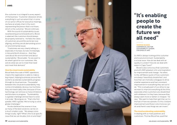 How the cloud meets sustainability Blood feels the scale of AWS ’ operations means the organisation is able to make a big impact , helping businesses around the world to accelerate sustainability progress through its cloud services . The parallel between the cloud and sustainability may not be immediately obvious , but he thinks they are inextricably linke , because of how technology can remove so many limitations and blockers to progress . “ Sustainability is a global challenge and we have to solve it at scale ,” Blood goes on . “ That ’ s the first parallel . AWS is global . We ’ re trying to solve global challenges .”