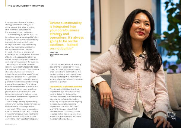 Cloud and AI as powerful enablers The strategic shift Hilary describes requires the right infrastructure and tools to deliver on that promise. For AWS, cloud and AI are becoming essential for sustainability leaders, especially for organisations navigating increasingly complex reporting requirements such as CSRD, TNFD and TCFD. Hilary points out that the breadth and complexity of data required makes manual approaches impractical, particularly as the rest of the organisation digitalises. aws. amazon. com