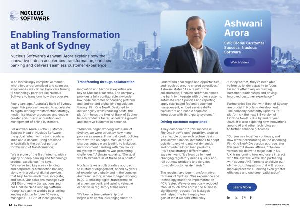 Partnerships like that with Bank of Sydney are crucial in Nucleus’ development. The company constantly updates its platforms – the next 8.5 version of FinnOne Neo ® is due by end of year 2025. It is also exploring new innovations around AI and other technologies to further enhance outcomes.