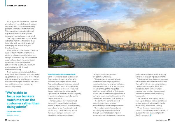 Continuous improvement ahead Bank of Sydney expects to transition from project-based transformation to continuous improvement once foundational systems are operational, marking a shift from catch-up mode to sustainable innovation. The cloudbased platform will enable regular updates from partners without requiring major internal projects or disruptive implementations.