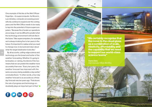 One example of this lies at the Met Offices fingertips – its supercomputer . As Moore ’ s Law dictates , computer processing power will only continue to expand over the coming years and the Met Office needs to be ready to tap into the potential of future supercomputers . “ Because the of scale our operations are so large , it can be difficult to predict what the technology environment will look like in the future . Take supercomputers , for example , we ’ re always looking five to ten years in the future . It ’ s important to realise what you need to change now , to be lucid and clear about what the target destination looks like .”