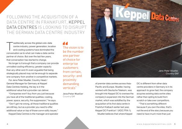 Jens Peter Mueller , Country GM of premier data centres across Asia- Pacific and Europe . Mueller , having worked with Deutsche Telekom , was brought into Keppel DC to oversee the company ’ s expansion into the German market , which was solidified by the acquisition of its first data centre in Frankfurt Kalbach earlier last year , Keppel DC Frankfurt 1 ( KDC FRA 1 ).