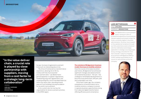 Lars Bettermann is a procurement expert , having 25 + years of professional experience in procurement relevant subjects and project scope . He holds a university degree in business administration . His know-how is based on the operational fundament he built up in the automotive sector enhanced with the methodical and strategic application in strategic sourcing project , being a strategy consultant for more than a decade . Today he is heading procurement at Bridgestone EMIA as a CPO , holding responsibility for all source-to-pay activities across the company .