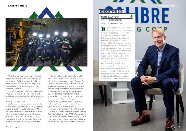 Thanks to the culture of sustainability and commitment to ESG that Calibre promotes across its workforce , Salopera ’ s job is enhanced that much more as he works with professional , trustworthy teams that have expressed their positivity toward the company ’ s core values . Employees understand the importance of the surrounding communities and , therefore , focus on providing social support where possible , alongside efforts to influence reforestation programs and reduce greenhouse gas ( GHG ) emissions .