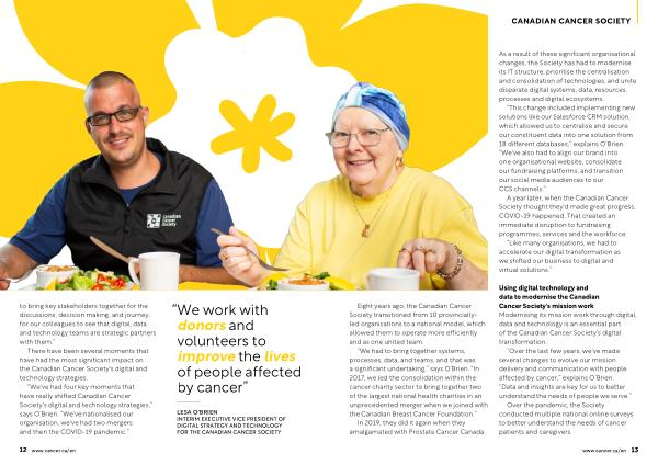“ We had to bring together systems , processes , data , and teams , and that was a significant undertaking ,” says O ’ Brien . “ In 2017 , we led the consolidation within the cancer charity sector to bring together two of the largest national health charities in an unprecedented merger when we joined with the Canadian Breast Cancer Foundation .” In 2019 , they did it again when they amalgamated with Prostate Cancer Canada .