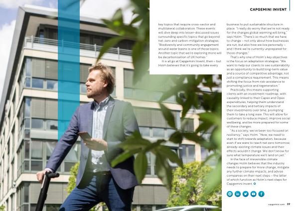In the face of irreversible climate changes Holm believes that the industry needs to prepare for more change , mitigate any further climate impacts , and advise companies on their next steps – the latter of which function as Holm ’ s next steps for Capgemini Invent . capgemini . com 19