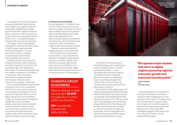 Cooling and sustainability By coming together, Chindata Group and HEC Group are also pioneering new technologies and more innovative ways to balance power and compute with sustainable design. Specifically, HEC brings deep expertise in liquid-cooling materials and precision manufacturing, while Chindata Group contributes years of operational insights from hyperscale data centres.“ Together we are building a fully integrated liquid cooling ecosystem – from materials and components to full systems – that eradicates the limitations of traditional approaches. Our goal is to deliver reliable, highefficiency cooling for high density server racks up to 300kW per rack, while pushing PUE and water usage effectiveness( WUE) performance close to theoretical limits,” Mr Wu explains.