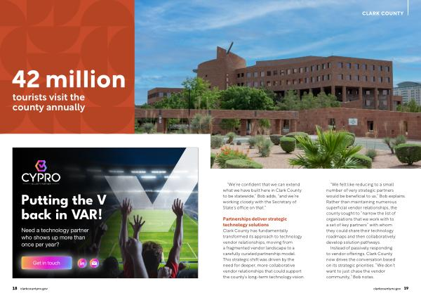 Partnerships deliver strategic technology solutions Clark County has fundamentally transformed its approach to technology vendor relationships, moving from a fragmented vendor landscape to a carefully curated partnership model. This strategic shift was driven by the need for deeper, more collaborative vendor relationships that could support the county’ s long-term technology vision.