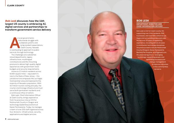 Bob Leek is CIO for Clark County, NV, supporting over 2.4m residents, 90K businesses, and over 42m visitors to Las Vegas and surrounding areas every year. He has over 25 years of leadership experience, including almost 20 years in information technology disciplines. His previous teams include Multnomah County( Oregon), Kaiser Permanente, Banfield Pet Hospital, and Egghead. com. His personal tag line is: leveraging technology, supporting people, and optimising processes and change management to improve outcomes in the communities we serve.