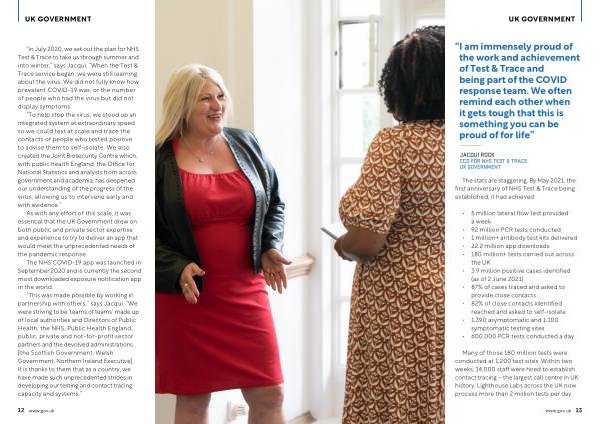 “ This was made possible by working in partnership with others ,” says Jacqui . “ We were striving to be ‘ teams of teams ’ made up of local authorities and Directors of Public Health , the NHS , Public Health England , public , private and not-for-profit sector partners and the devolved administrations [ the Scottish Government , Welsh Government , Northern Ireland Executive ]. It is thanks to them that as a country , we have made such unprecedented strides in developing our testing and contact tracing capacity and systems .”