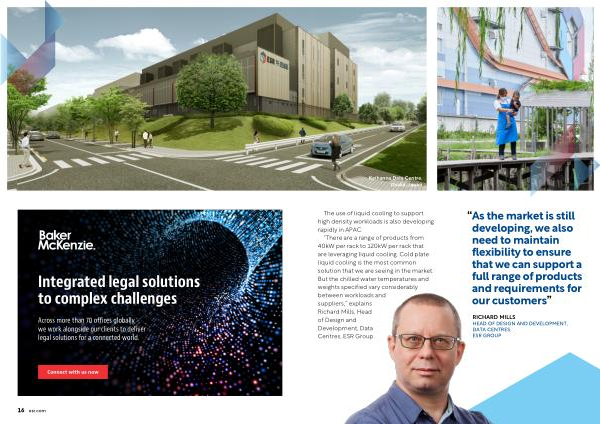 “ There are a range of products from 40kW per rack to 120kW per rack that are leveraging liquid cooling . Cold plate liquid cooling is the most common solution that we are seeing in the market . But the chilled water temperatures and weights specified vary considerably between workloads and suppliers ,” explains Richard Mills , Head of Design and Development , Data Centres , ESR Group .