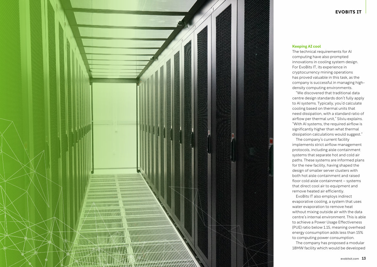 Keeping AI cool The technical requirements for AI computing have also prompted innovations in cooling system design . For EvoBits IT , its experience in cryptocurrency mining operations has proved valuable in this task , as the company is successful in managing highdensity computing environments .