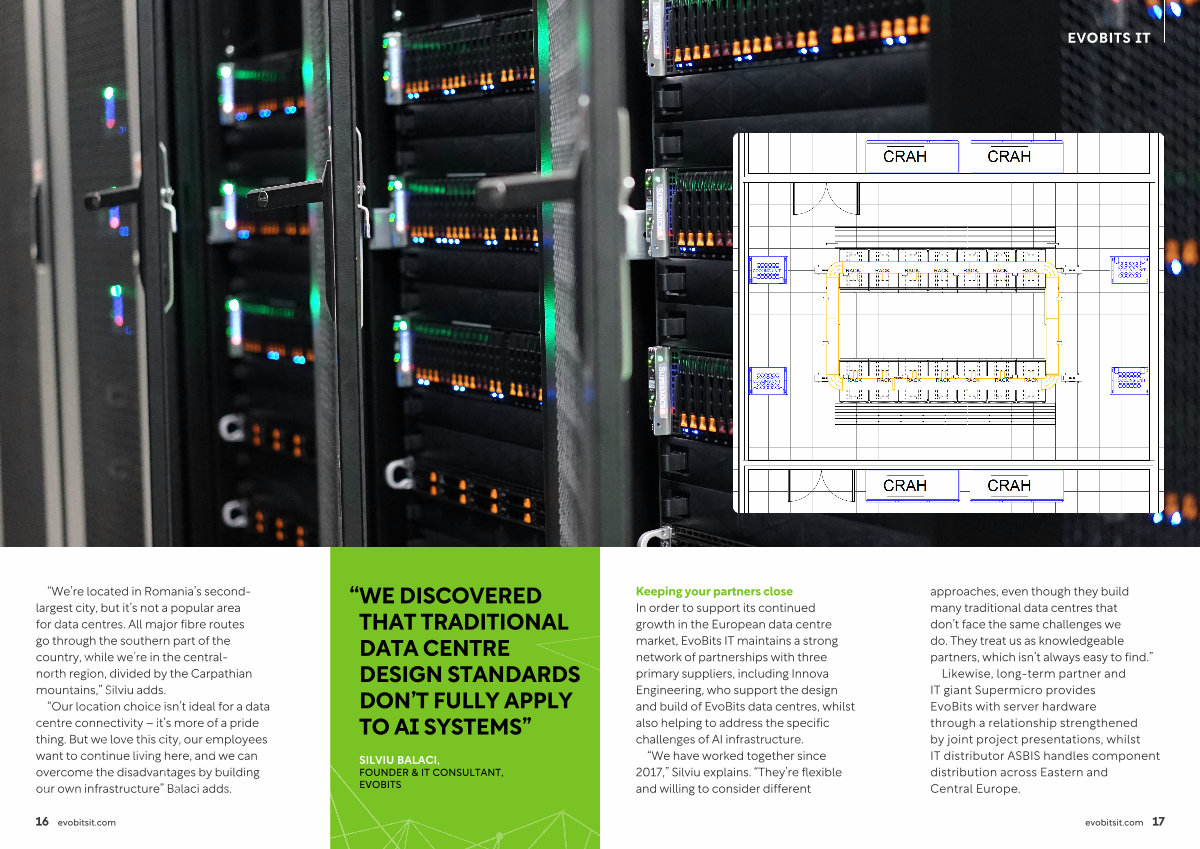 Keeping your partners close In order to support its continued growth in the European data centre market , EvoBits IT maintains a strong network of partnerships with three primary suppliers , including Innova Engineering , who support the design and build of EvoBits data centres , whilst also helping to address the specific challenges of AI infrastructure .