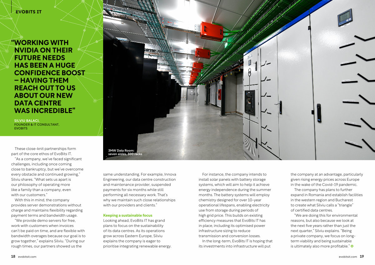Keeping a sustainable focus Looking ahead , EvoBits IT has grand plans to focus on the sustainability of its data centres . As its operations grow across Eastern Europe , Silviu explains the company is eager to prioritise integrating renewable energy .