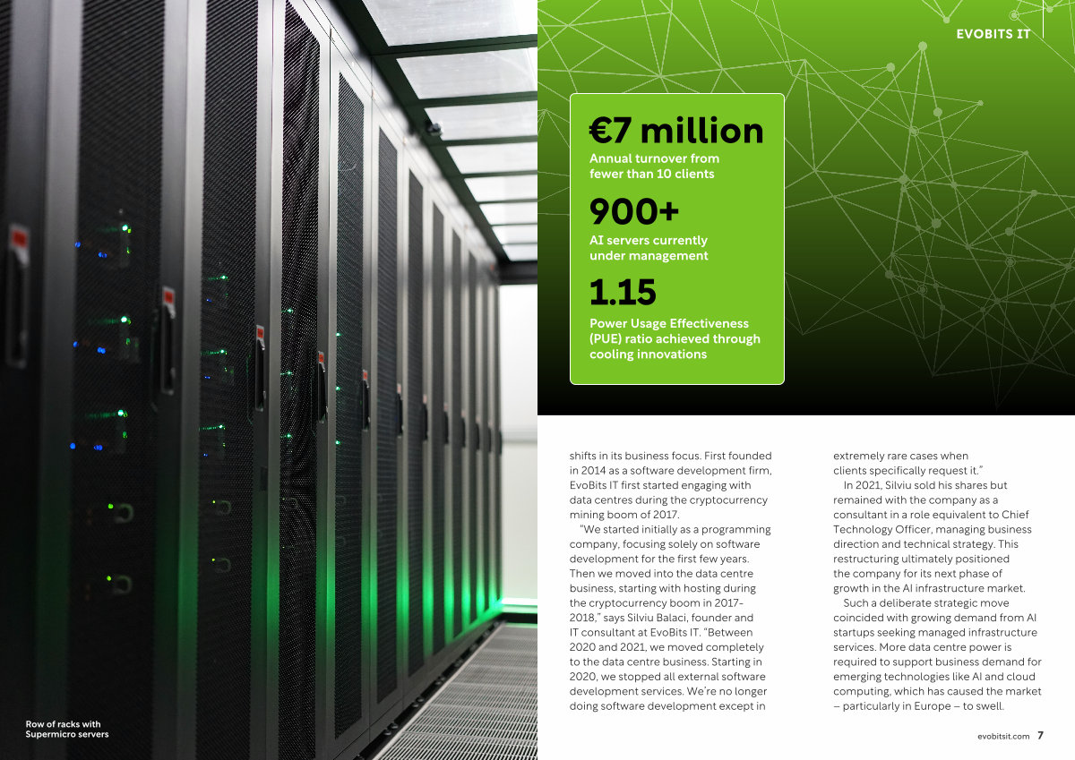 “ We started initially as a programming company , focusing solely on software development for the first few years . Then we moved into the data centre business , starting with hosting during the cryptocurrency boom in 2017- 2018 ,” says Silviu Balaci , founder and IT consultant at EvoBits IT . “ Between 2020 and 2021 , we moved completely to the data centre business . Starting in 2020 , we stopped all external software development services . We ’ re no longer doing software development except in extremely rare cases when clients specifically request it .”