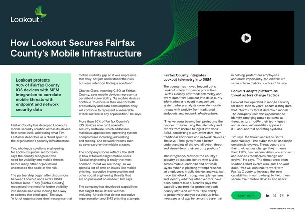The county has moved beyond using Lookout solely for device protection. Fairfax County now feeds telemetry and event data from Lookout into its security information and event management system, where analysts correlate mobile threats with activity from traditional endpoints and network infrastructure.