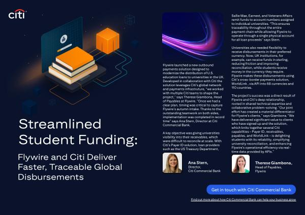 Flywire launched a new outbound payments solution designed to modernize the distribution of U. S. education loans to universities in the UK. Developed in collaboration with Citi the solution leverages Citi ' s global network and payments infrastruture,“ we worked with multiple Citi teams to shape the project,” says Therese Giambona, Head of Payables at Flywire.“ Once we had a clear plan, timing was critical to capture Flywire’ s autumn intake. Thanks to the outstanding teamwork on both sides, implementation was completed in record time” says Ana Stern, Director at Citi Commercial Bank.