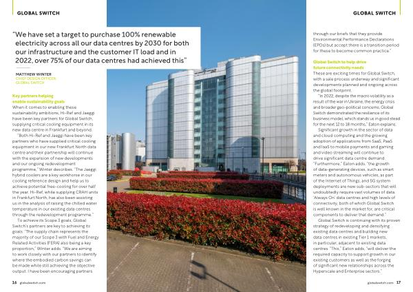 “ Both Hi-Ref and Jaeggi have been key partners who have supplied critical cooling equipment in our new Frankfurt North data centre and their partnership will continue with the expansion of new developments and our ongoing redevelopment programme ,” Winter describes . “ The Jaeggi hybrid coolers are a key workhorse in our cooling reference design and help us to achieve potential free-cooling for over half the year . Hi-Ref , while supplying CRAH units in Frankfurt North , has also been assisting us in the analysis of raising the chilled water temperature in our existing data centres through the redevelopment programme .” To achieve its Scope 3 goals , Global Switch ’ s partners are key to achieving its goals . “ The supply chain represents the majority of our Scope 3 with Fuel and Energy Related Activities ( FERA ) also being a key proportion ,” Winter adds . “ We are aiming to work closely with our partners to identify where the embodied carbon savings can be made while still achieving the objective output . I have been encouraging partners