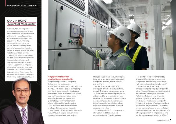 Batam’ s submarine cable infrastructure includes 12 cables with direct links to Singapore, enabling sub-2 millisecond latency connections.“ We think Batam is very strategic, given it’ s got 12 submarine cables of its own, directly connecting with Singapore, and can offer less than 2ms of latency,” says Nicholas.“ Customers could potentially come here to Batam and then leverage that location and the strategic position of Singapore as one of the key data centre hubs in APAC.”