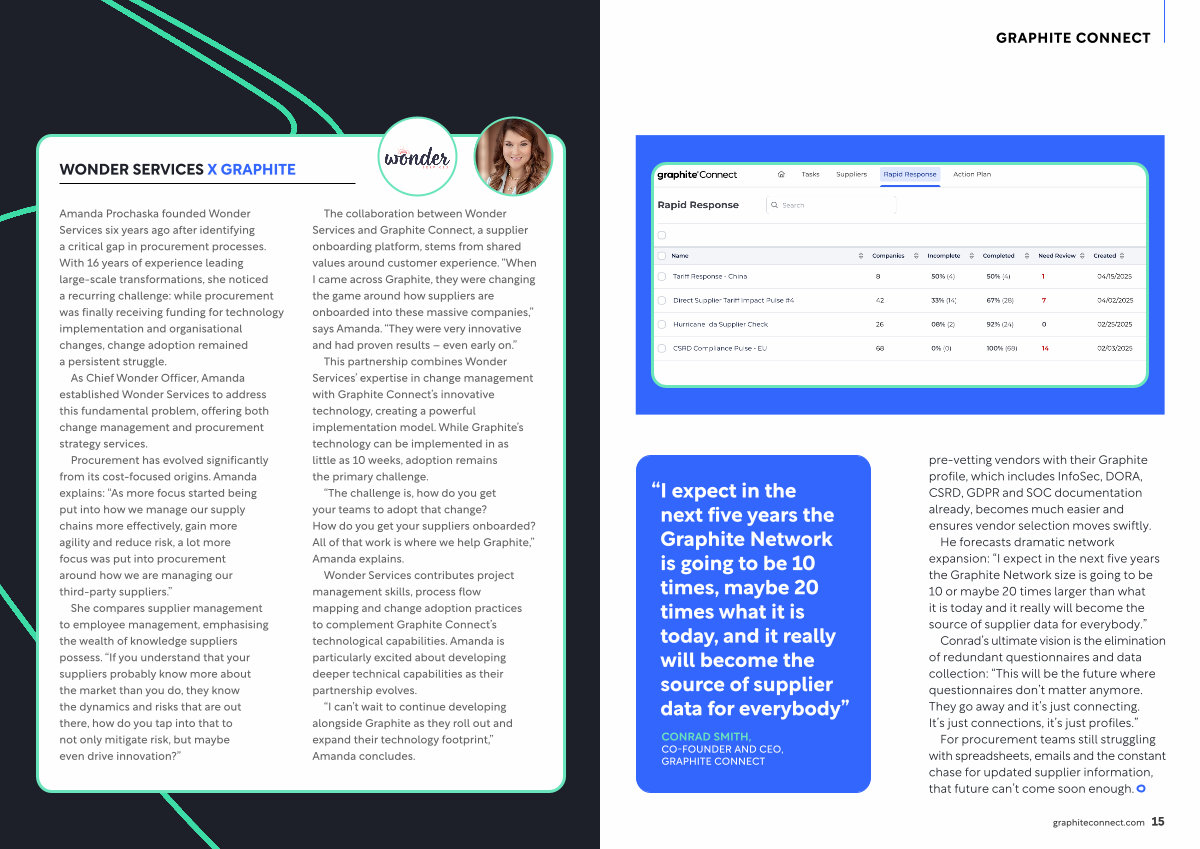 pre-vetting vendors with their Graphite profile, which includes InfoSec, DORA, CSRD, GDPR and SOC documentation already, becomes much easier and ensures vendor selection moves swiftly.