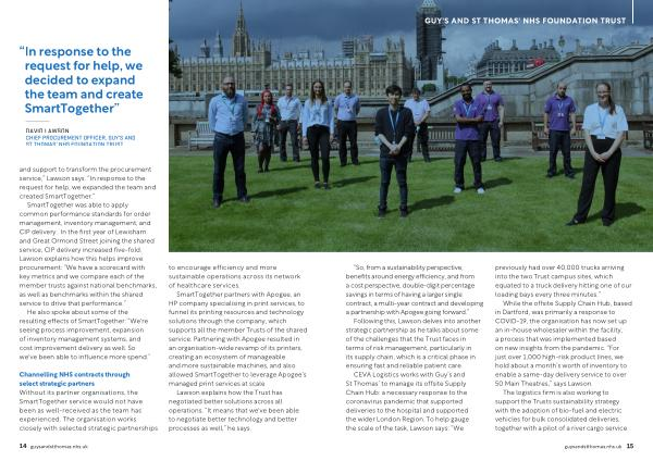 CEVA Logistics works with Guy ’ s and St Thomas ’ to manage its offsite Supply Chain Hub : a necessary response to the coronavirus pandemic that supported deliveries to the hospital and supported the wider London Region . To help gauge the scale of the task , Lawson says : “ We previously had over 40,000 trucks arriving into the two Trust campus sites , which equated to a truck delivery hitting one of our loading bays every three minutes .”