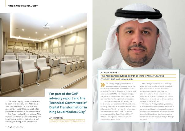 Mr . Alroby , a highly experienced IT leader with extensive expertise in the healthcare sector . In his current role as the Associate Executive Director of Systems and Application at KSMC , Mr . Alroby manages the digital , solutions , and applications that are essential for the organisation ’ s success . Throughout his career , Mr . Alroby has held several key positions in the healthcare industry , including as a Consultant in Health Affairs at the Ministry of Health . He has also served as the Head of IT-PMO and Head of Analytics at King Saud Medical City , IT Director at King Saud Medical City , and eHealth Center Director .