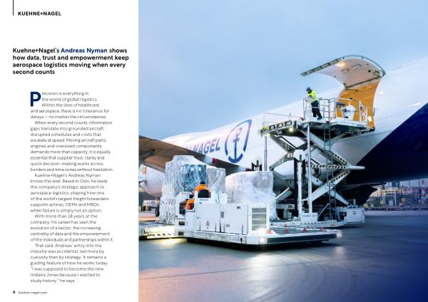 Kuehne + Nagel’ s Andreas Nyman knows this well. Based in Oslo, he leads the company’ s strategic approach to aerospace logistics, shaping how one of the world’ s largest freight forwarders supports airlines, OEMs and MROs when failure is simply not an option.