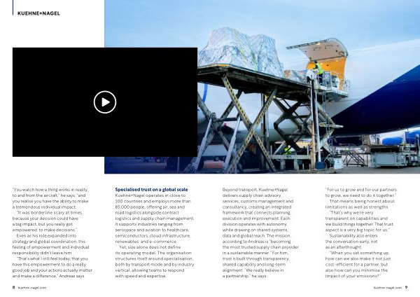 Beyond transport, Kuehne + Nagel delivers supply chain advisory services, customs management and consultancy, creating an integrated framework that connects planning, execution and improvement. Each division operates with autonomy while drawing on shared systems, data and global reach. The mission, according to Andreas is“ becoming the most trusted supply chain provider in a sustainable manner.” For him, trust is built through transparency, shared capability and long-term alignment.“ We really believe in a partnership,” he says.