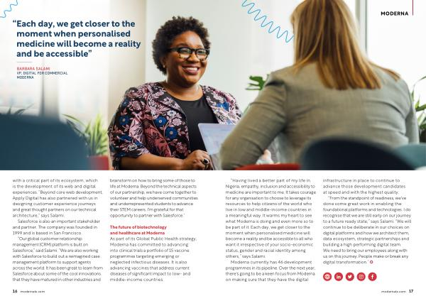 “ From the standpoint of readiness , we ' ve done some great work in enabling the foundational platforms and technologies . I do recognise that we are still early on our journey to a future ready state ,” says Salami . “ We will continue to be deliberate in our choices on digital platforms and how we architect them , data ecosystem , strategic partnerships and building a high performing digital team . We need to bring our employees along with us on this journey . People make or break any digital transformation .” modernatx . com 17