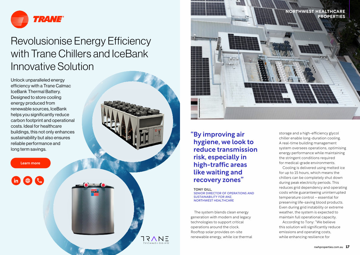 storage and a high-efficiency glycol chiller enable long-duration cooling. A real-time building management system oversees operations, optimising energy performance while maintaining the stringent conditions required for medical-grade environments.