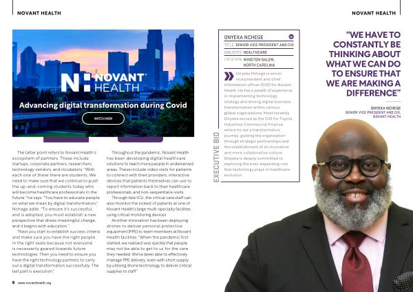 Onyeka Nchege is senior vice president and chief information officer ( CIO ) for Novant Health . He has a wealth of experience in implementing technology strategy and driving digital business transformation within various global organisations . Most recently , Onyeka served as the CIO for Toyota Industries Commercial Finance , where he led a transformative journey , guiding the organisation through strategic partnerships and the establishment of an innovative and more collaborative culture . Onyeka is deeply committed to exploring the ever-expanding role that technology plays in healthcare evolution .