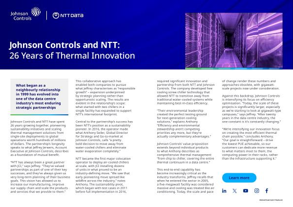 required significant innovation and partnership from both NTT and Johnson Controls. The company developed free cooling screw chiller technology that allowed NTT to transition away from traditional water-cooled systems while maintaining best-in-class efficiency.