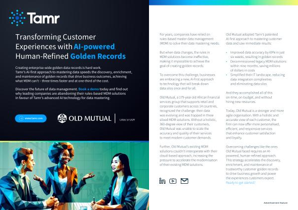 Further , Old Mutual ’ s existing MDM solutions couldn ’ t interoperate with their cloud-based approach , increasing the pressure to accelerate the modernisation of their existing MDM solutions . Old Mutual adopted Tamr ’ s patented AI-first approach to mastering customer data and saw immediate results :