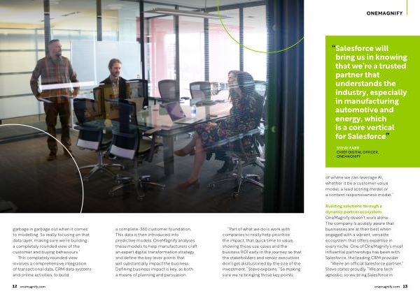 Building solutions through a dynamic partner ecosystem OneMagnify doesn ’ t work alone . The company is acutely aware that businesses are at their best when engaged with a vibrant , versatile ecosystem that offers expertise in every niche . One of OneMagnify ’ s most influential partnerships has been with Salesforce , the leading CRM provider .