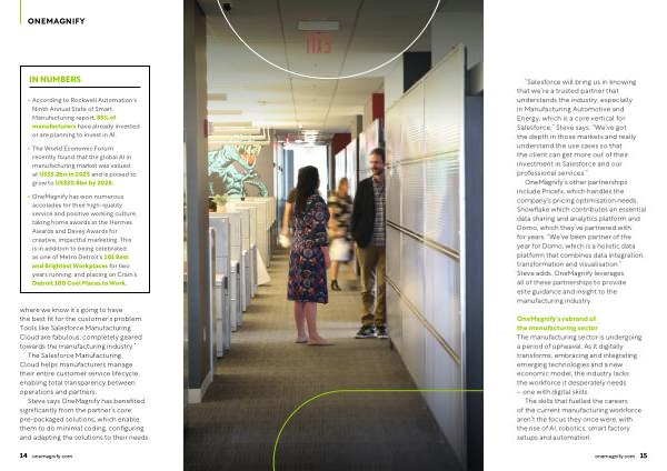 OneMagnify ’ s other partnerships include Pricefx , which handles the company ’ s pricing optimisation needs , Snowflake which contributes an essential data sharing and analytics platform and Domo , which they ’ ve partnered with for years . “ We ’ ve been partner of the year for Domo , which is a holistic data platform that combines data integration , transformation and visualisation .” Steve adds . OneMagnify leverages all of these partnerships to provide elite guidance and insight to the manufacturing industry .