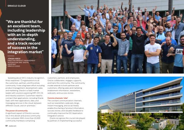 Speaking about OIC ’ s industry recognition , Kress explained : “ Congratulations to all the customers , partners , and the whole community . It was a big team effort including product management , development , sales , and marketing . Oracle is a SaaS market leader with solutions spanning ERP , CM , CX , and industry solutions . Customers need to connect their applications , including Oracle SaaS , with their applications , data , and messaging services in the cloud , between different clouds , and on-premises .”