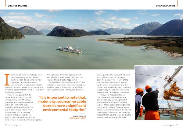 Many would guess that it ’ s something ‘ in the air ’. In truth , almost every call , WhatsApp message and video conference relies on submarine cable installed by Orange Marine . To put it into context , this is manmade cable , laid at the very bottom of the seabed ; a very real , tactile operation carried out by a crew of men and women navigating the high seas . Amid the digitisation of our world it is a refreshing reminder that ‘ actual ’ things are still happening !