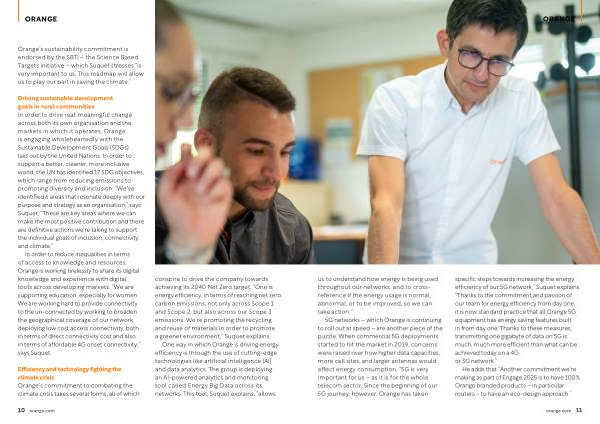 5G networks – which Orange is continuing to roll out at speed – are another piece of the puzzle . When commercial 5G deployments started to hit the market in 2019 , concerns were raised over how higher data capacities , more cell sites , and larger antennas would affect energy consumption . “ 5G is very important for us – as it is for the whole telecom sector . Since the beginning of our 5G journey , however , Orange has taken specific steps towards increasing the energy efficiency of our 5G network ,” Suquet explains . “ Thanks to the commitment and passion of our team for energy efficiency from day one , it is now standard practice that all Orange 5G equipment has energy saving features built in from day one . Thanks to these measures , transmitting one gigabyte of data on 5G is much , much more efficient than what can be achieved today on a 4G or 3G network .”