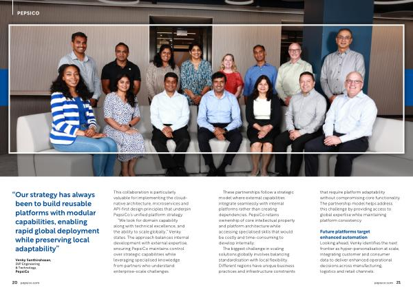 This collaboration is particularly valuable for implementing the cloudnative architecture, microservices and API-first design principles that underpin PepsiCo’ s unified platform strategy.“ We look for domain capability along with technical excellence, and the ability to scale globally,” Venky states. The approach balances internal development with external expertise, ensuring PepsiCo maintains control over strategic capabilities while leveraging specialised knowledge from partners who understand enterprise-scale challenges.