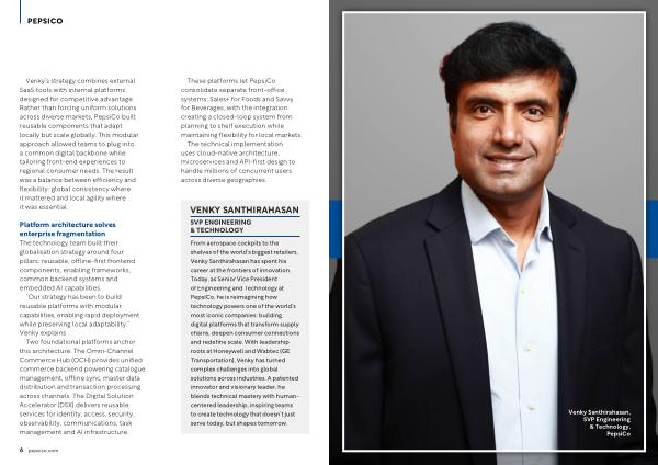 From aerospace cockpits to the shelves of the world’ s biggest retailers, Venky Santhirahasan has spent his career at the frontiers of innovation. Today, as Senior Vice President of Engineering and Technology at PepsiCo, he is reimagining how technology powers one of the world’ s most iconic companies: building digital platforms that transform supply chains, deepen consumer connections and redefine scale. With leadership roots at Honeywell and Wabtec( GE Transportation), Venky has turned complex challenges into global solutions across industries. A patented innovator and visionary leader, he blends technical mastery with humancentered leadership, inspiring teams to create technology that doesn’ t just serve today, but shapes tomorrow.