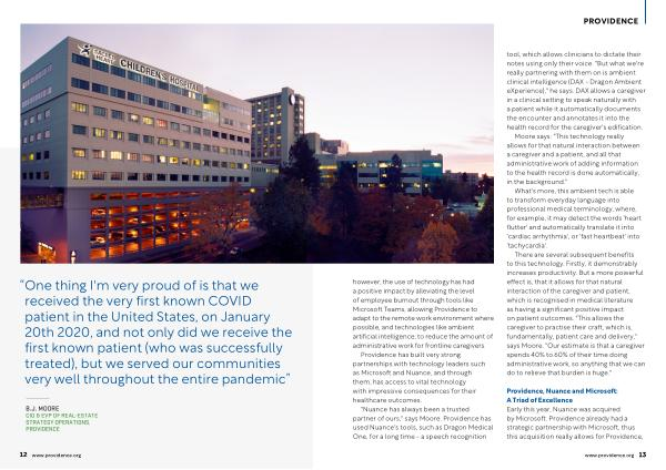 " Nuance has always been a trusted partner of ours ," says Moore . Providence has used Nuance ' s tools , such as Dragon Medical One , for a long time - a speech recognition tool , which allows clinicians to dictate their notes using only their voice . " But what we ' re really partnering with them on is ambient clinical intelligence ( DAX - Dragon Ambient eXperience )," he says . DAX allows a caregiver in a clinical setting to speak naturally with a patient while it automatically documents the encounter and annotates it into the health record for the caregiver ' s edification .