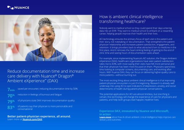 For example , since implementing Nuance ’ s ACI solution , the Dragon Ambient eXperience ( DAX ), healthcare organizations have seen patient satisfaction rates rise to 83 %, with most saying their visits have felt more personal and that their physician has been more focused on them . Physicians spend less time looking at computer screens , documenting care , and working after hours . With Nuance DAX , they can focus on delivering higher-quality care to more patients — without burning out .