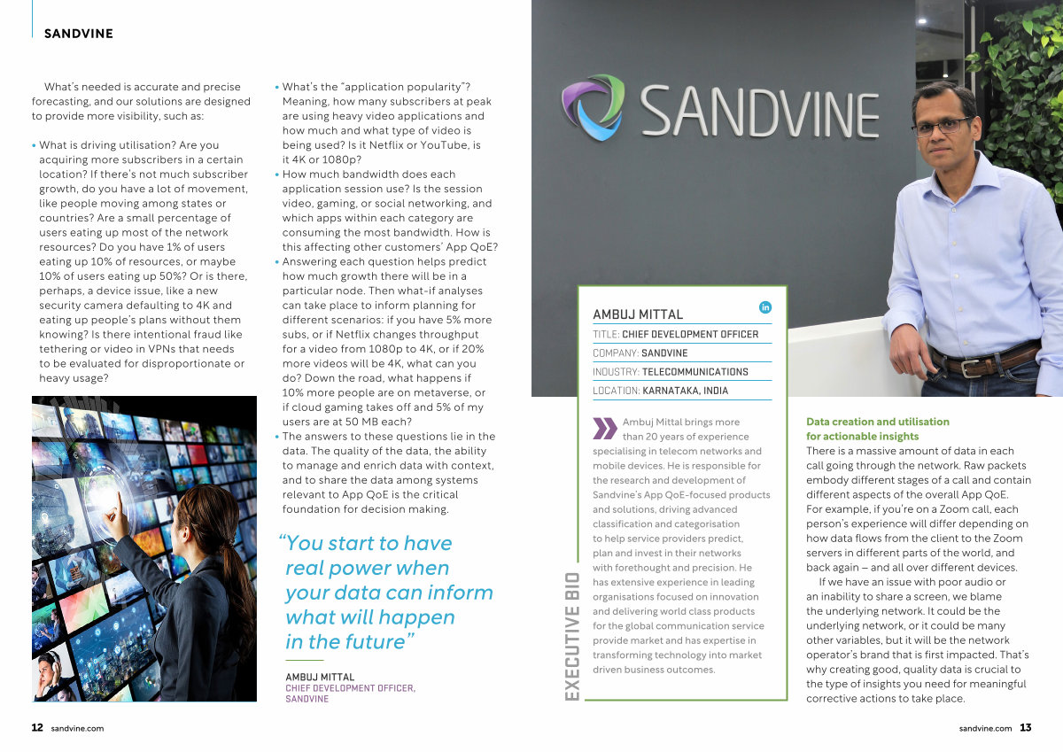 Ambuj Mittal brings more than 20 years of experience specialising in telecom networks and mobile devices. He is responsible for the research and development of Sandvine’ s App QoE-focused products and solutions, driving advanced classification and categorisation to help service providers predict, plan and invest in their networks with forethought and precision. He has extensive experience in leading organisations focused on innovation and delivering world class products for the global communication service provide market and has expertise in transforming technology into market driven business outcomes.